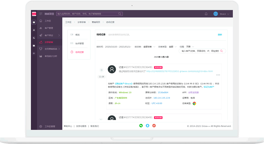 工作区代表一个运营的项目,承载项目的业绩增长功能和运营数据