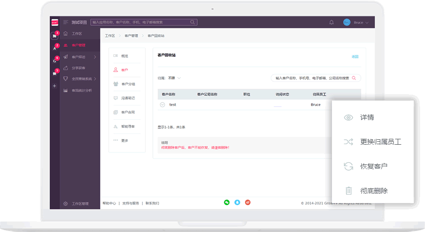 客户被删除后,进入客户回收站,可以更换归属员工、也可以恢复、或者彻底删除