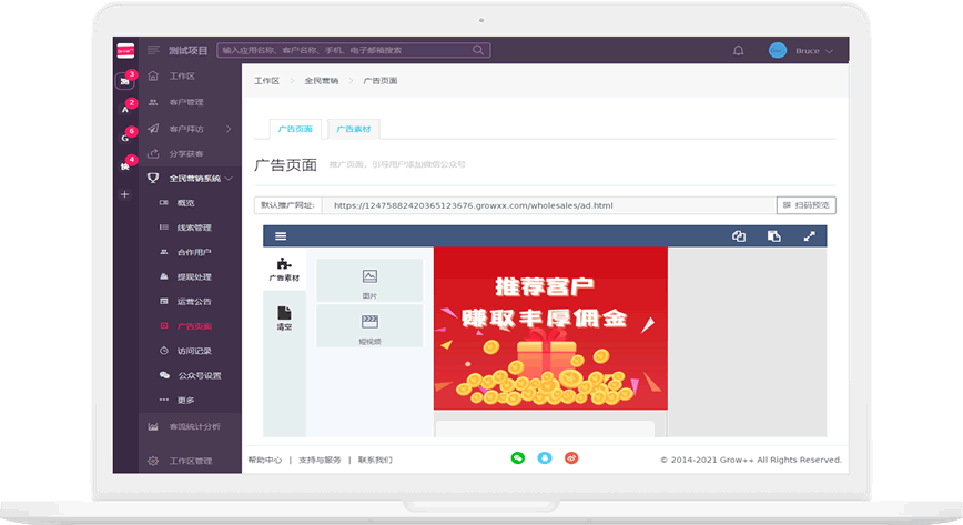工作区代表一个运营的项目,承载项目的业绩增长功能和运营数据