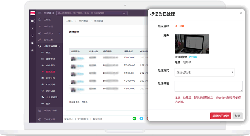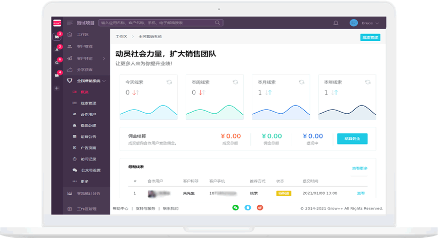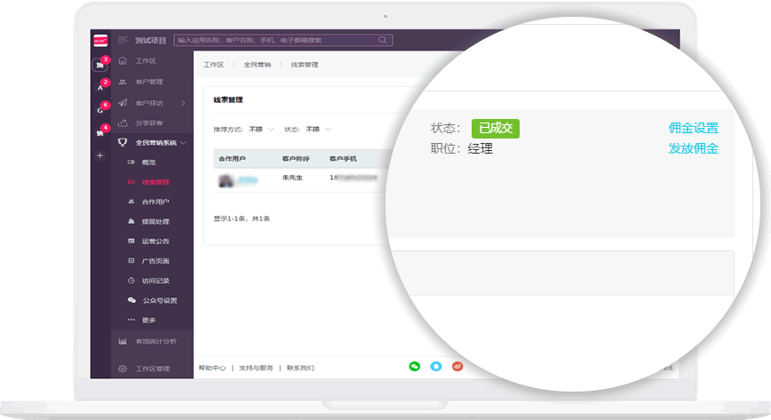 管理合作用户,查看合作用户提交的线索、收入记录、提现记录
